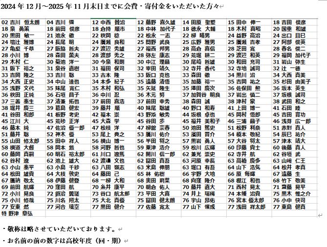 OB会員 活躍情報・報告 2025.12.19 0 25年12月初旬 OB会発送のお知らせとお詫び OB会事務局からの連絡です。 2025年12月初旬にOB会案内を発送いたしました。ご確認ください。 その中で、OB会費納入のお願いの裏面に2024年12月より2025年11月末日まで年会費・寄付金をいただいた方々のお名前を掲載いたしましたが、納入者一覧の文字が見えにくい状態のまま印刷をいたしました。誠に申し訳ありません。 鮮明なdataをここに掲載いたします。 この記事はいかがでしたか? 良かったら下記のボタンで教えてください。 0 投稿者: 高校27回 阪脇 OB会員 活躍情報・報告 コメント: 0 【日時変更】新年総会の案内等の発送作業(お手伝い募集!) 前の記事 関連記事 OB会員 活躍情報・報告 2019.09.06 0 「第39回全国高等学校クイズ選手権」茨高生出場の件 9/13 (金) 21:00 日本テレビにて放映予定の、上記「クイズ選手権」に茨高生が出場すると言うことを小耳に挟みましたのでお知らせいたします。 OB会員 活躍情報・報告 2024.10.04 12 高69浦田勇太君 キングオブコント決勝進出 2016ハイスクール漫才優勝の高69浦田勇太君が今度はプロとしてキングオブコント2024ファイナルに進出しました。エントリー3139組から勝ち上がった10組による決勝戦。芸名は浦田スターク、トリオ名はcacao です。10月12日(土)18時30分〜TBS系列で生放送。応援します! イベント・会合・事務連絡 2016.04.21 0 新入部員 和田です。いつもお世話になっております。昨日新」年生の所属クラブが確定し、野球部は男子部員10名、女子マネージャー3名が新たに加わることになりました。昨年と比べるとやや少ない感はいなめませんがしっかりと育てていきたいと思っています。またお暇がありましたら試合や練習を除きに来ていただければ幸いです。 OB会員 活躍情報・報告 2016.09.03 0 (続)ハイスクール漫才甲子園 前回、台風の影響?でお預けを食らった、TBS「朝チャン」の密着レポートの件ですが、9/6(火)に放映との情報を入手しましたのでお知らせいたします。今度も台風に吹き飛ばされるかもしれませんが。 試合情報 2017.07.29 0 大阪大会準決勝 今日は大阪大会準決勝⚾️大阪桐蔭ー履正社戦本部席にはOBの47期松枝さんがドクターとしてそして、62期谷垣くんは二塁塁審として試合に臨むそうです。TV放映もあるので、観る楽しみが増えました!! OB会員 活躍情報・報告 2014.10.25 1 高52回卒 神木優さん、大阪公演 faceboookのグループではお知らせしましたが、こちらでも。野球部OBで俳優の神木優さんが、ソロアクト「モモタロ」をひっさげて、大阪凱旋公演です。日時は、11月30日日曜日。高槻にて。くわしくはこちら↓http://ameblo.jp/yuhkamiki/entry-11943578 コメント 0 コメント 0 トラックバック この記事へのコメントはありません。 トラックバックURL この記事へのトラックバックはありません。 返信をキャンセルする。 名前(例:山田 太郎)( 必須 ) E-MAIL( 必須 ) - 公開されません - URL Δ